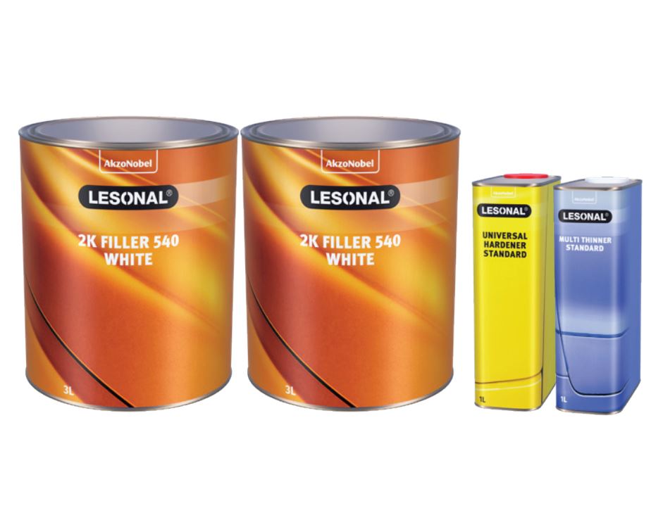 Akcijski set polnilo bela 2K FILLER 540 STANDARD 6L+1L+1L Lesonal obsega 6 litrov polnila 2K FILLER 540, 1 liter trdilca UNIVERSAL HARDENER STANDARD in 1 liter razredčila MULTI THINNER STANDARD.