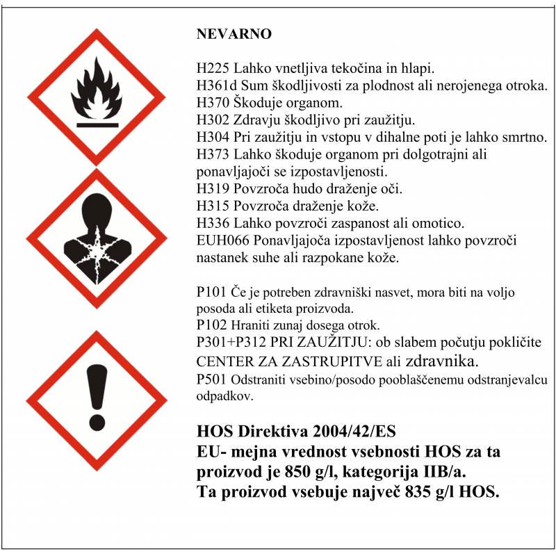 Ne vsebuje nobenih kloriranih ogljikovodikov in je v skladu z zakonodajo Direktive 2004/42/CE (VOC).