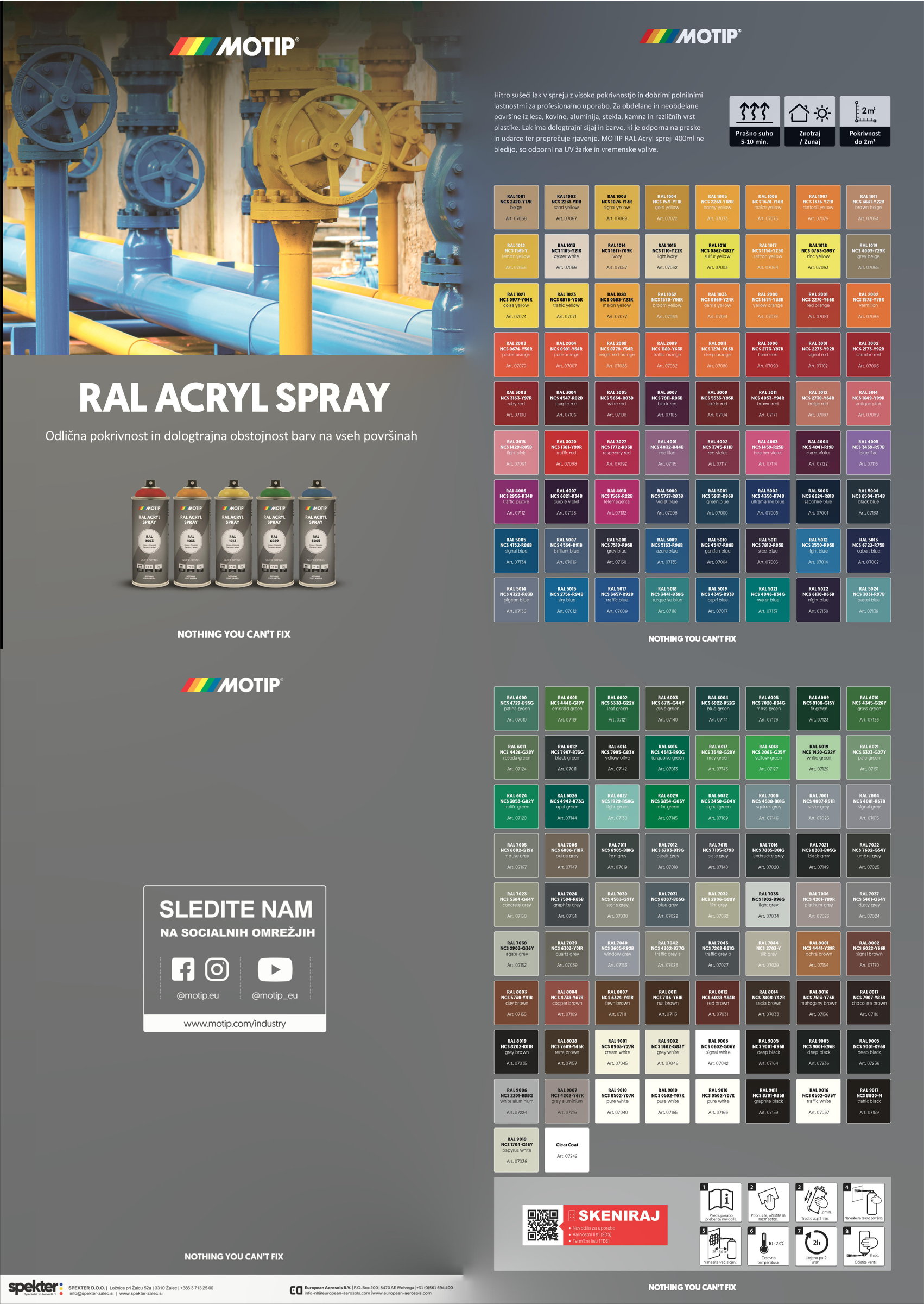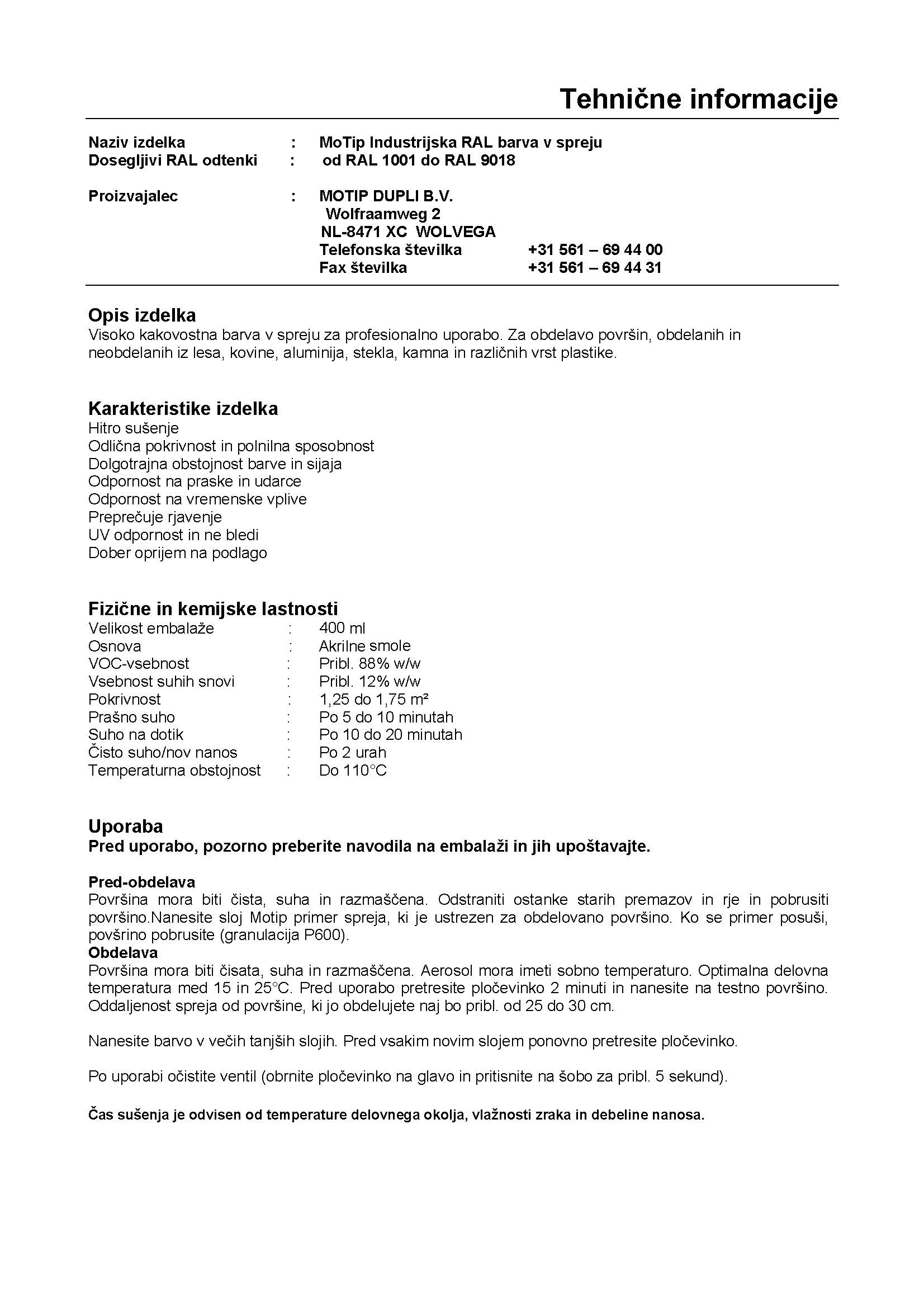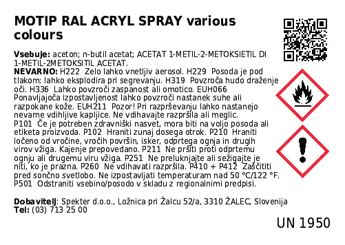Industrijski akrilni lak sprej RAL HG 400ml Motip je odporna, hitro sušeča in dobro pokrivna sprej akrilna barva za notranjo in zunanjo uporabo.