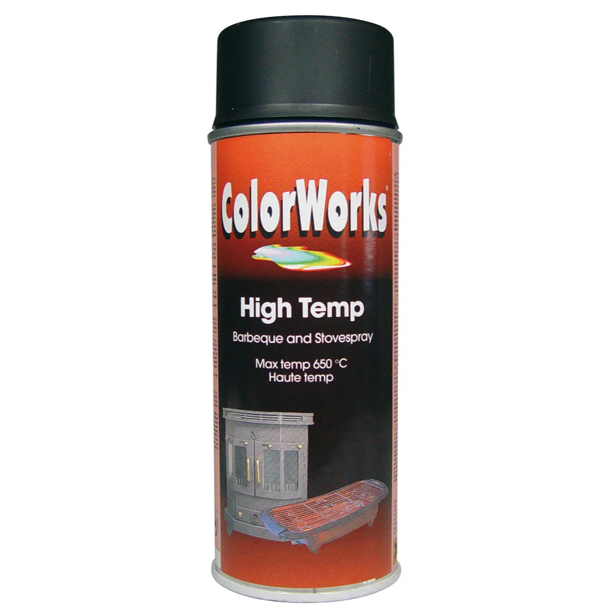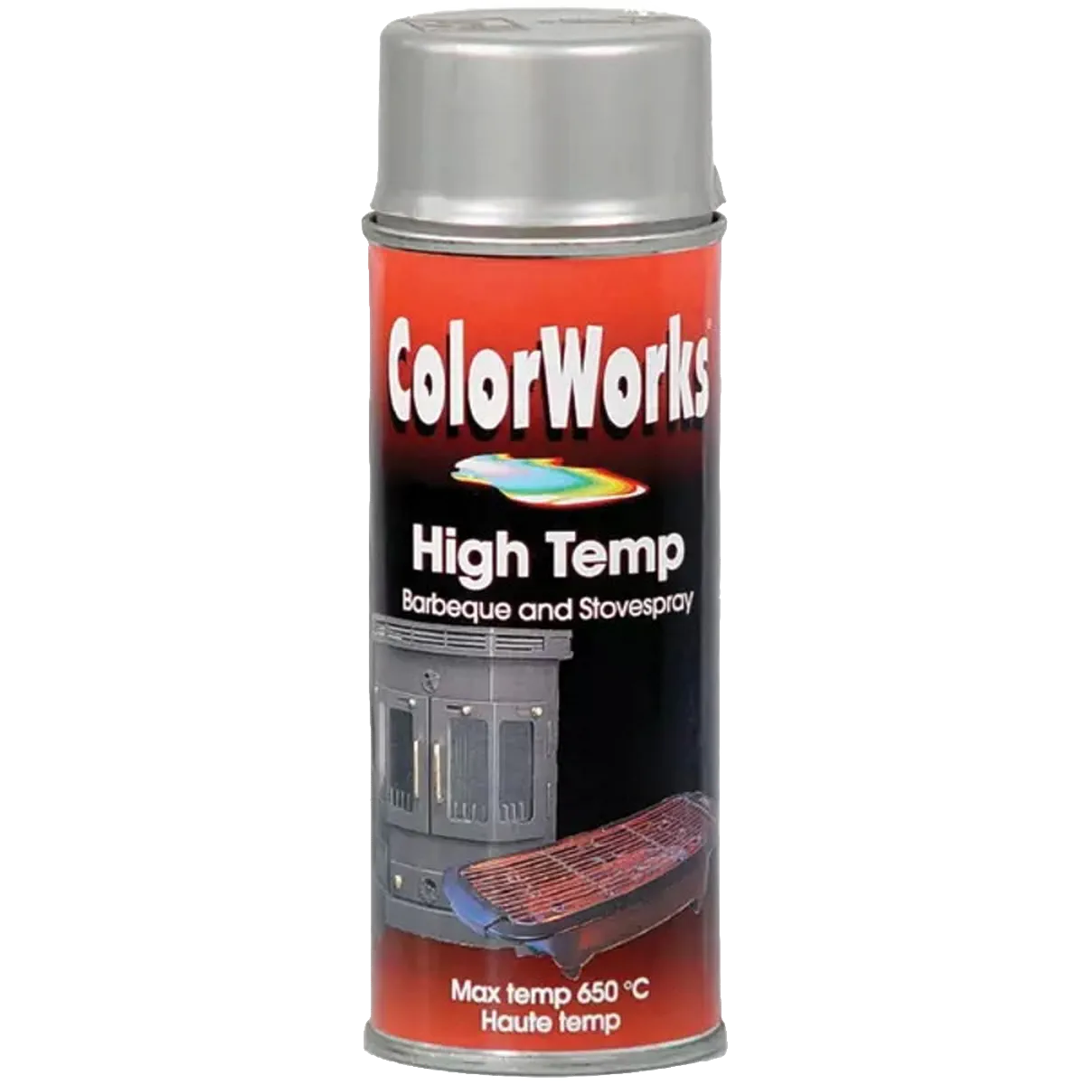 Temperaturni sprej 650°C HIGH TEMP 400ml Colorworks je ognjevzdržni lak za golo kovino brez predhodne temeljne barve. Za obnovitev žara ali štedilnika.