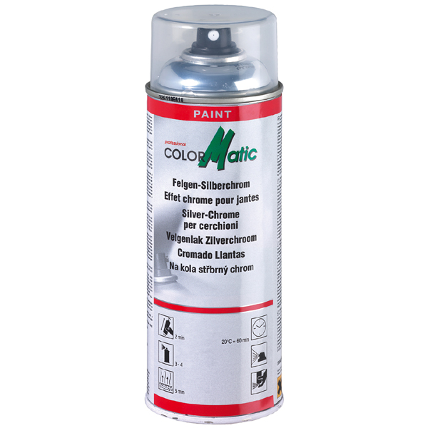 Sprej za platišča WHEEL SILVER CHROME 696879 ColorMatic je visokega sijaja z videzom kroma, idealen za barvanje novih ali rabljenih avtomobilskih platišč.