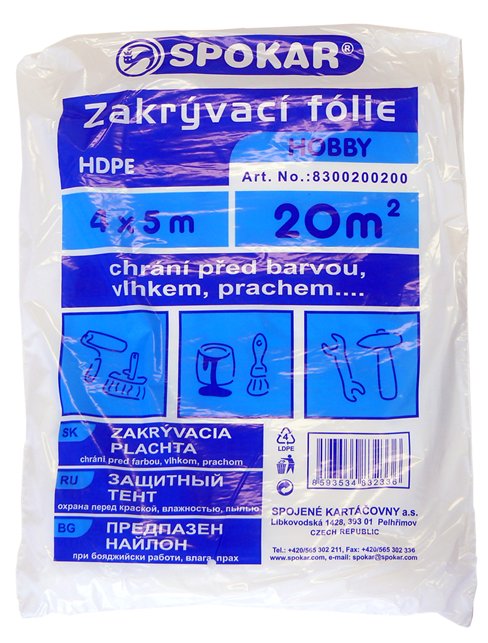 Zaščitna folija za pleskanje HDPE 5my 4x5M Spokar je izjemno lahka in cenovno ugodna zaščitna folija, namenjena hitri zaščiti površin pri pleskanju.